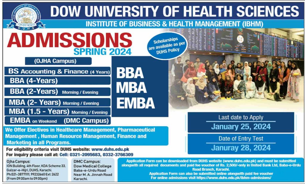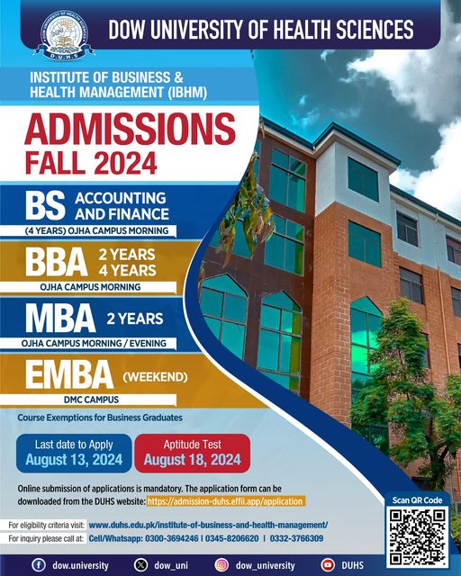 Admissions in BBA, BSAF, MBA, and EMBA Programs at the Institute of Business & Health Management (IBHM), Dow University of Health Sciences (DUHS)