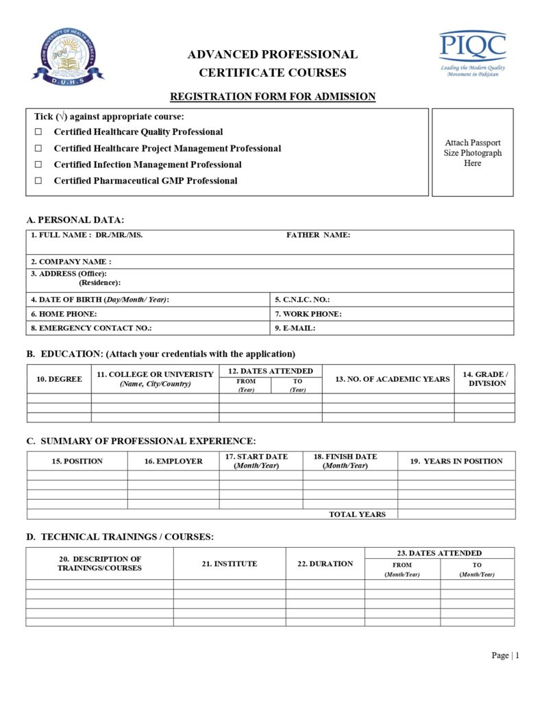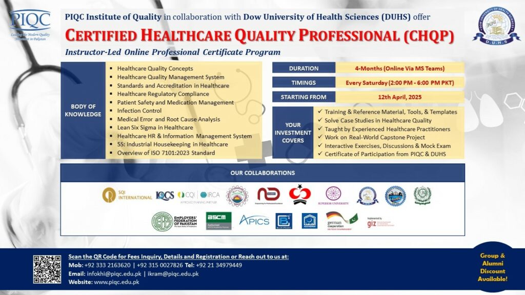 (PIQC-KHI): PIQC Institute of Quality is proud to announce the 24rd Batch of its “CERTIFIED HEALTHCARE QUALITY PROFESSIONAL (CHQP)” certificate program in collaboration with Dow University of Health Sciences (DUHS).