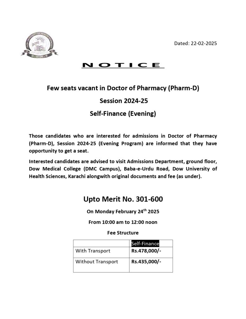 Few Seats Vacant in Doctor of Pharmacy (Pharm-D) Session 2024-25 (Self Finance – Evening)