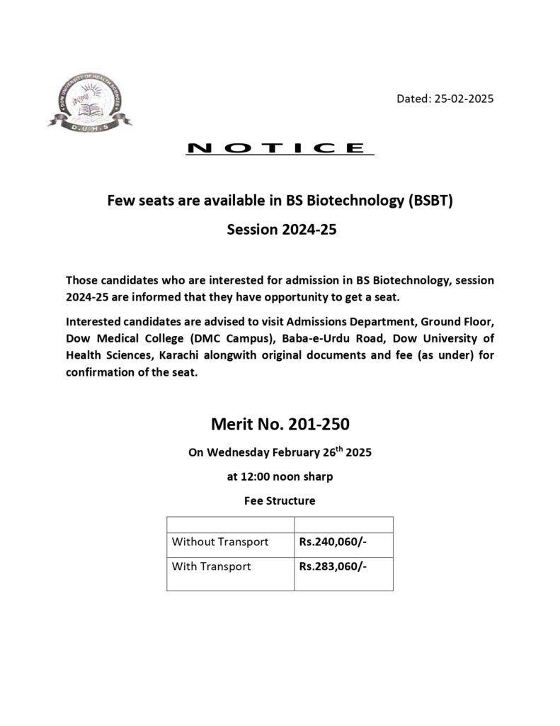 NOTICE – Few seats are available in BS Biotechnology (BSBT) Session 2024-25