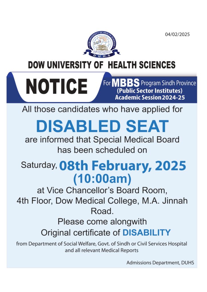 NOTICE for Disabled Seat – MBBS program (Public Sector Institutes) (Session 2024-25)