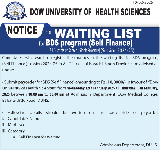 NOTICE – for Waiting List in BDS program (Self Finance) (All District of Karachi, Sindh Province) (Session 2024-25)