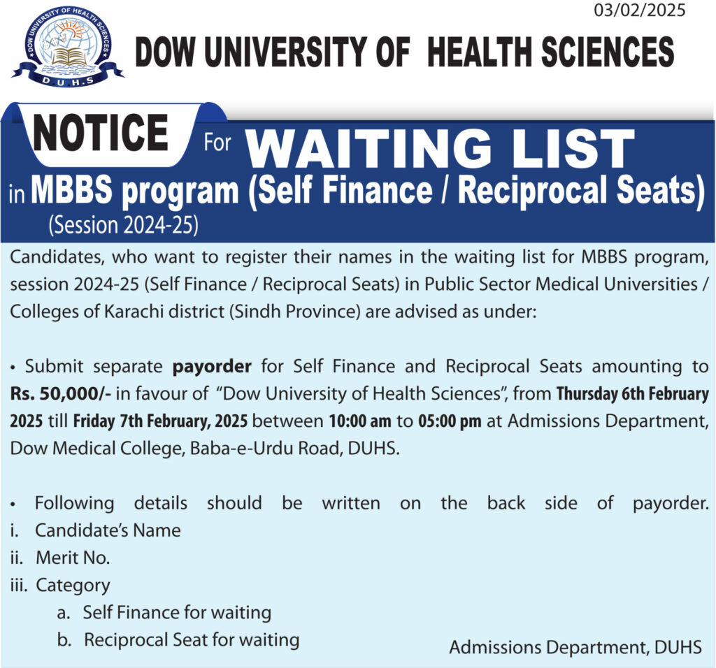 NOTICE for Waiting List in MBBS program (Self Finance / Reciprocal Seats) (Session 2024-25)