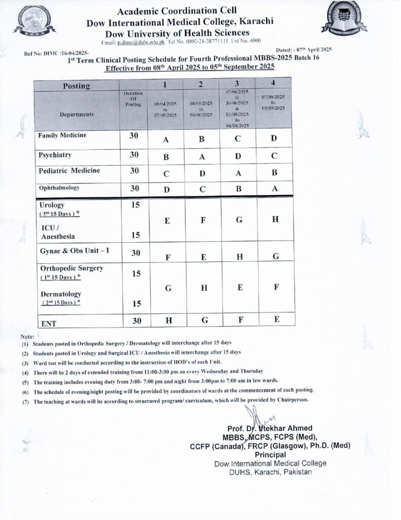 Clinical posting schedule for Fourth Professional MBBS 2025