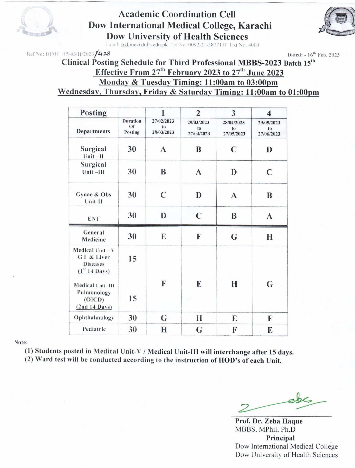Clinical Posting Schedule for Third Professional MBBS-2023 Batch 15