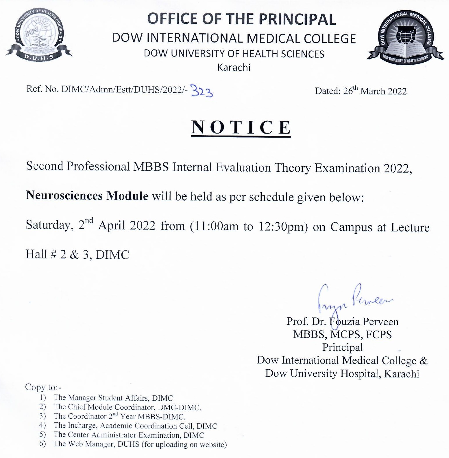 NOTICE – Second Year MBBS Internal Evaluation Theory Examination 2022 (Neurosciences Module)