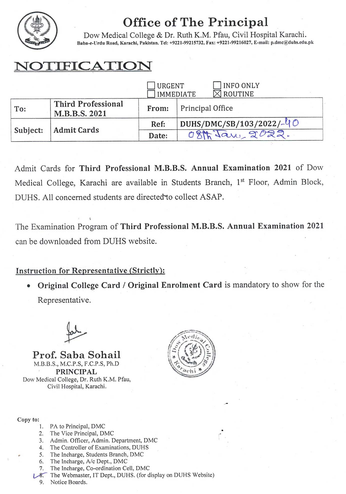 Admit Cards for 3rd Professional MBBS Annual Examination 2021