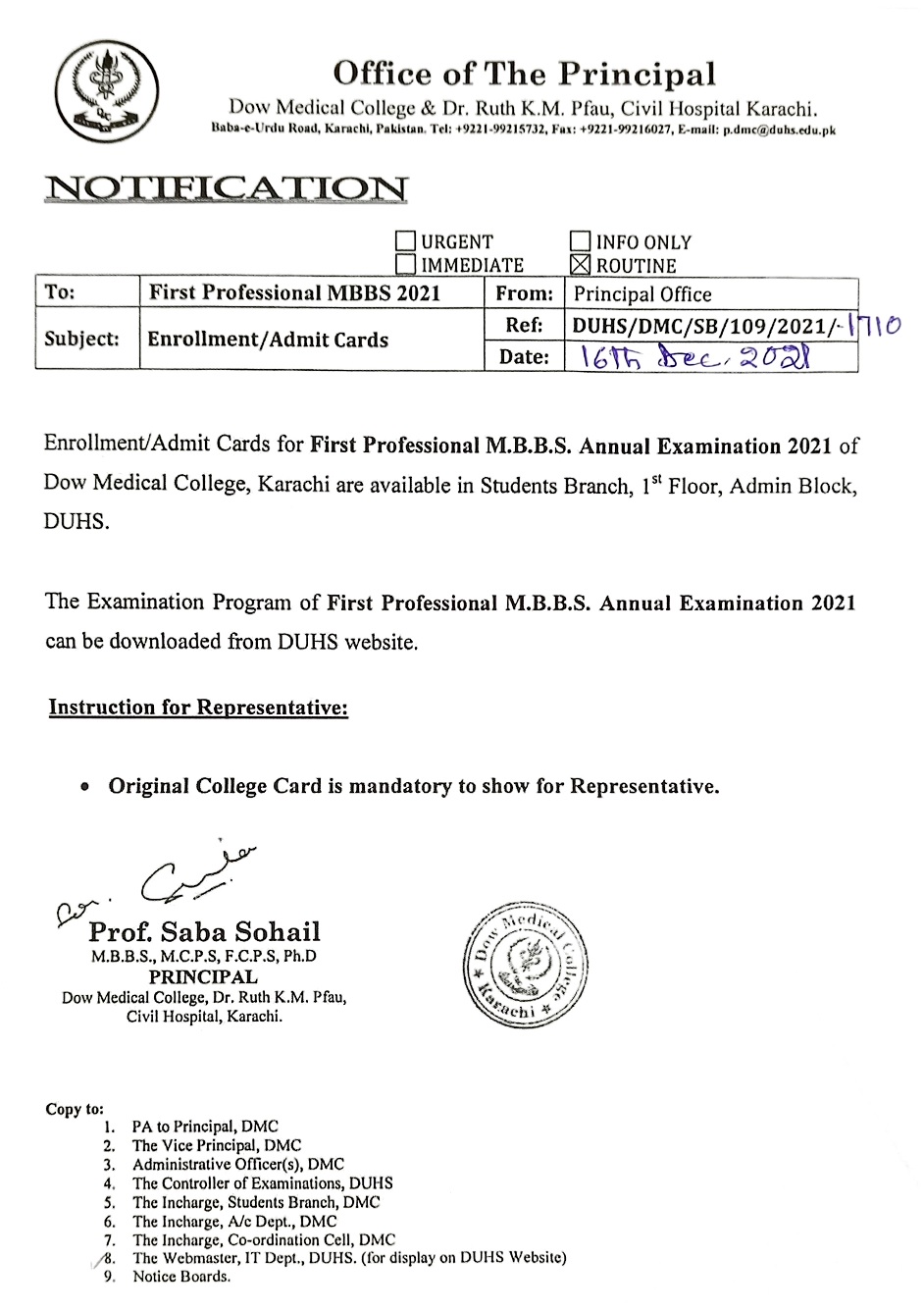[DMC] Enrollment/Admit Cards for First Year MBBS Annual Examination 2021