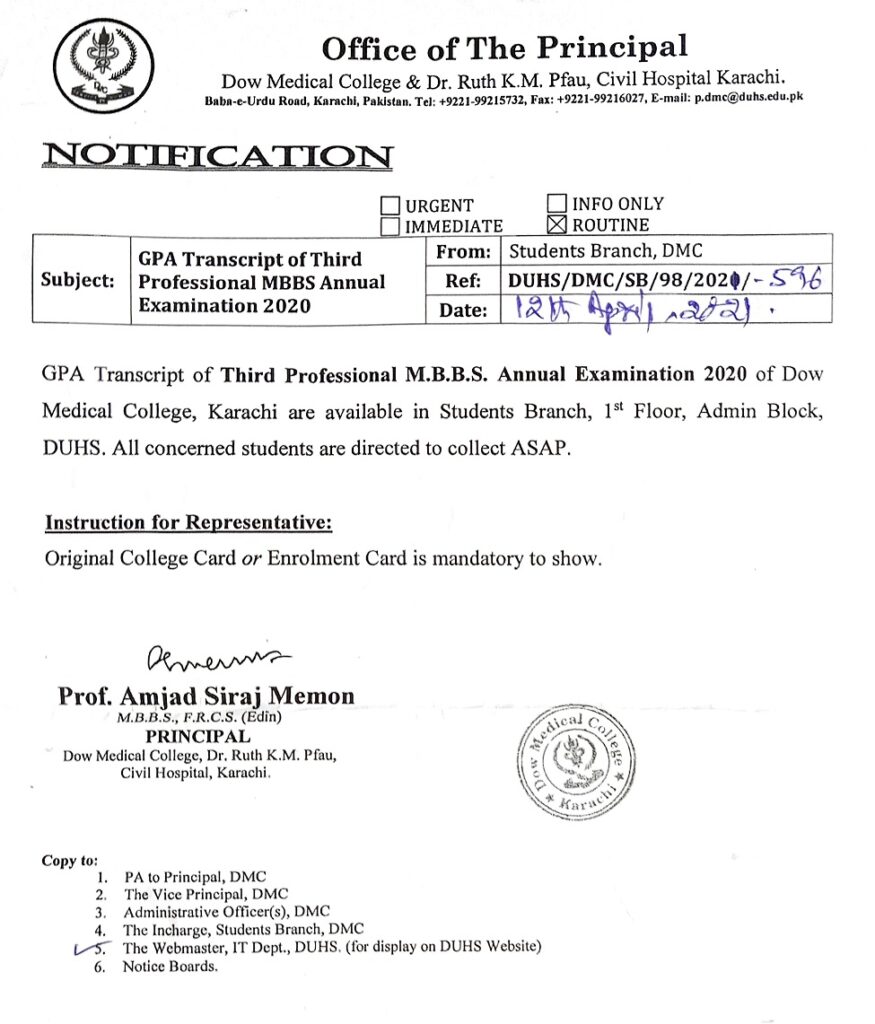 GPA Transcript of Third Professional MBBS Annual Examination 2020