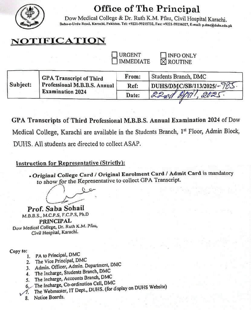 GPA Transcript of Third Professional MBBS Annual Examination 2024