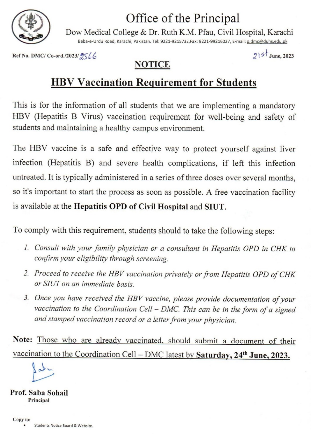 Notice for HBV Vaccination Requirement for Students