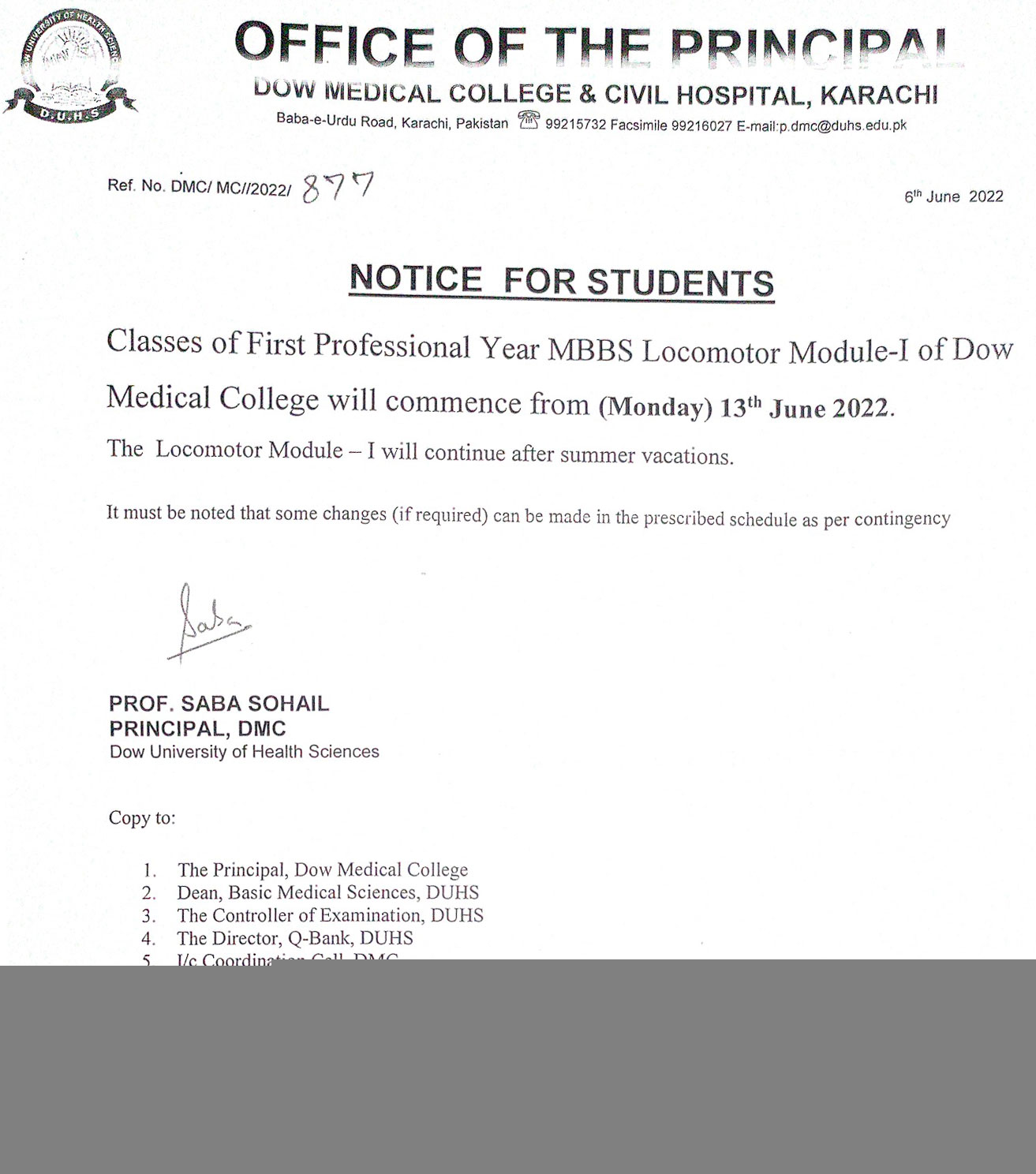 NOTICE FOR STUDENTS – CLASSES OF FIRST PROFESSIONAL YEAR MBBS LOCOMOTOR MODULE – I