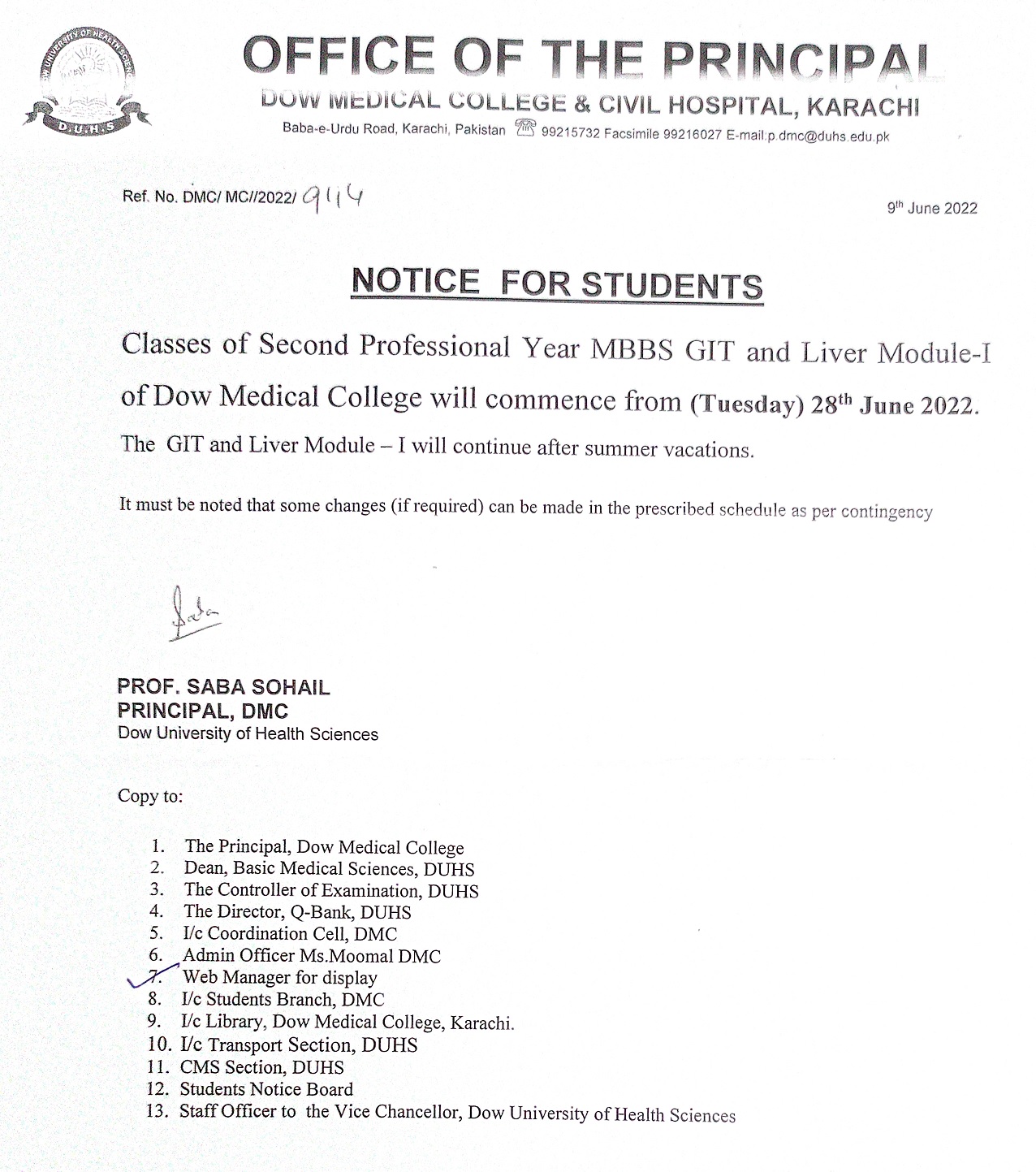 Notice For Second Professional Year MBB Students