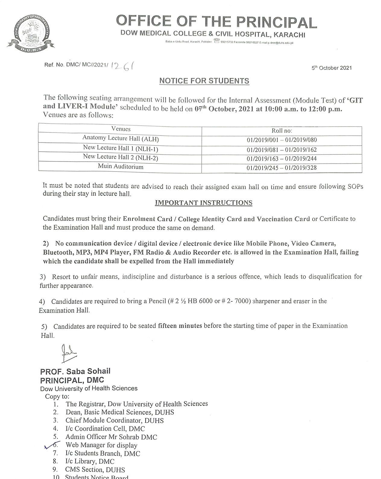 Notice for Students – Internal Assessment (Module Test) of RENAL and EXCRETORY – I Module