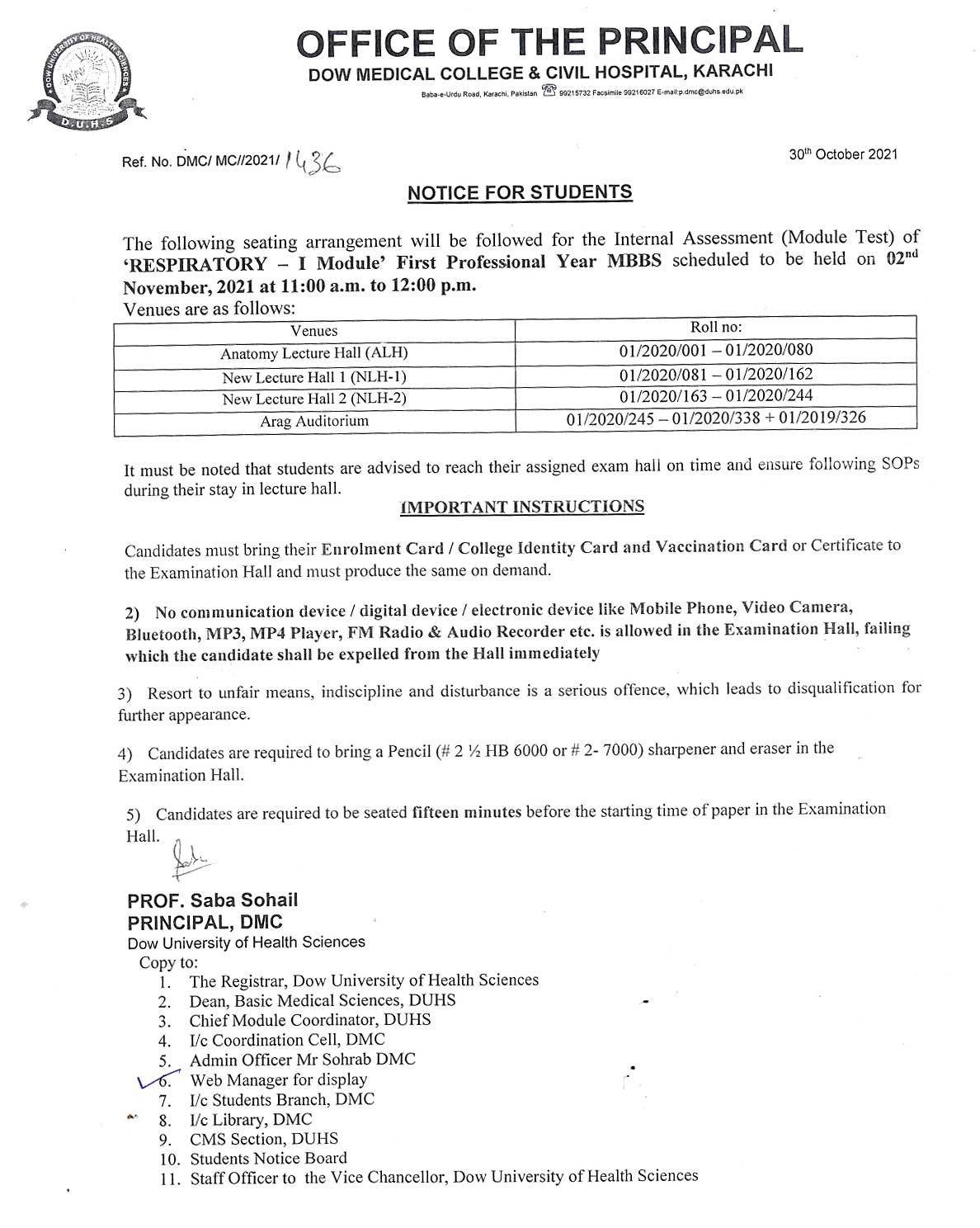 Notice for Students – Module Test of Respiratory – I Module – First Professional MBBS 2021