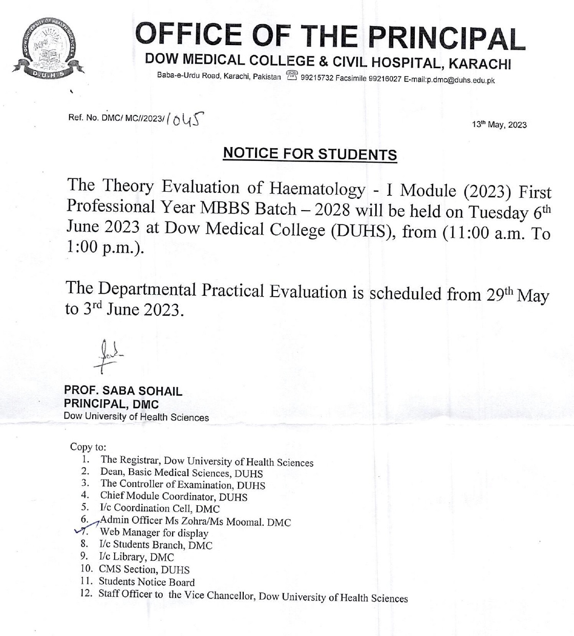 Notice for Students – Theory Evaluation First Professional Year MBBS