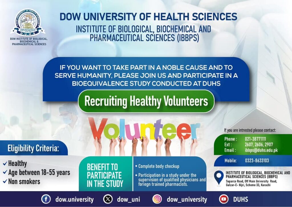Dow Institute of Biological, Biochemical & Pharmaceutical Sciences (IBBPS-DUHS) is recruiting healthy volunteers for its upcoming Bioequivalence study.