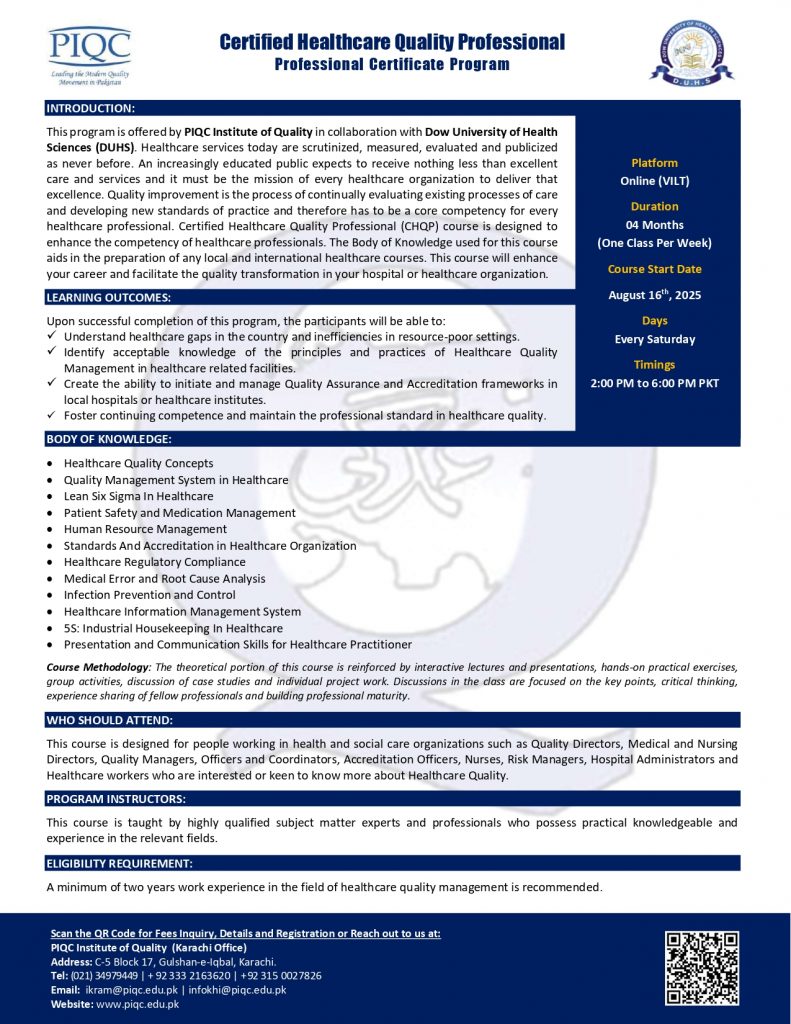 PIQC Institute of Quality is proud to announce the 25th Batch of its “CERTIFIED HEALTHCARE QUALITY PROFESSIONAL (CHQP)” certificate program in collaboration with Dow University of Health Sciences (DUHS).