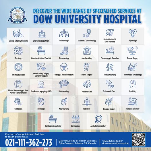 At Dow University Hospital, we strive to deliver exceptional healthcare through diverse specialized services. From everyday medical care to complex treatments, our skilled professionals are dedicated to meeting your health needs with expertise and empathy.