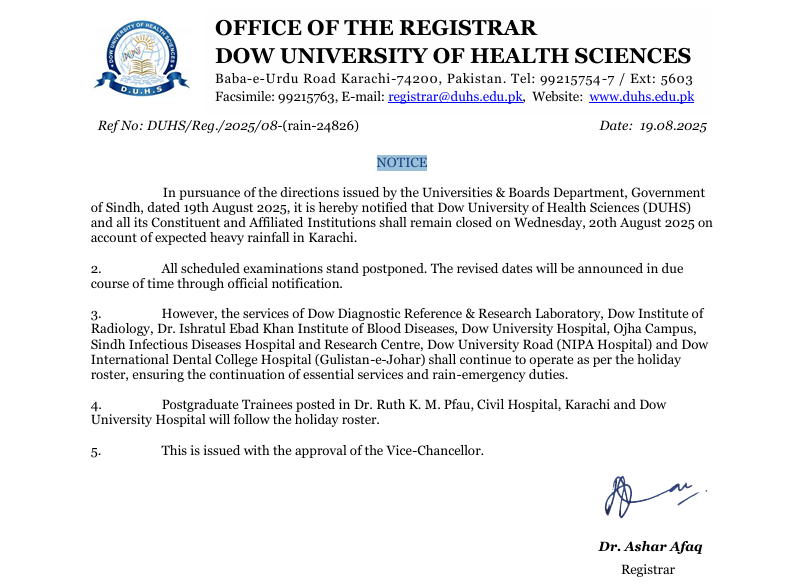 NOTICE: Dow University of Health Sciences (DUHS) and all its Constituent and Affiliated Institutions shall remain closed on Wednesday, 20th August 2025
