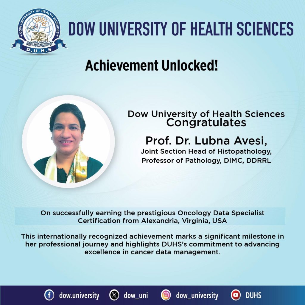 Dow University of Health Sciences congratulates Prof. Dr. Lubna Avesi on becoming Pakistan’s first certified Oncology Data Specialist, funded by the prestigious DOGANA Program!