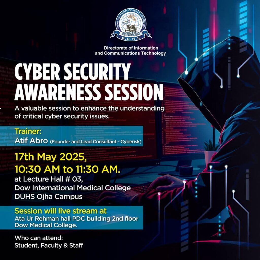 The Directorate of Information and Communications Technology at Dow University of Health Sciences (DUHS) is organizing a Cyber Security Awareness Session to strengthen understanding of critical cybersecurity issues.
