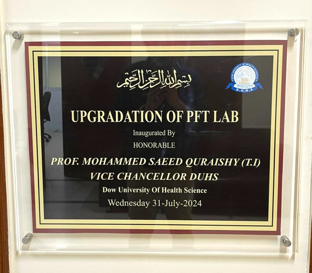 State of the art Pulmonary function test (PFT) lab including Spirometry, Lung Volumes and Lung Diffusion Capacity (DLCO) was inaugurated by Honorable Vice Chancellor Prof. Mohammed Saeed Quraishy T.I and Pro Vice Chancellor and MS Prof. Jahan Ara Hassan at Dow University Hospital, Ojha Campus.