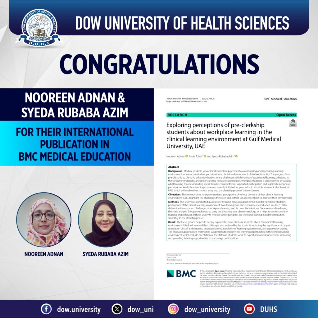 Dow Institute of Health Professions Education (DIHPE) is proud to celebrate the recent achievements of Dr. Noreen Adnan and Dr. Syeda Rubab Azim. Their research, titled “Exploring Perceptions of Pre-clerkship Students about Workplace Learning in the Clinical Learning Environment at Gulf Medical University, UAE,” has been published in the prestigious international journal, BMC Medical Education.