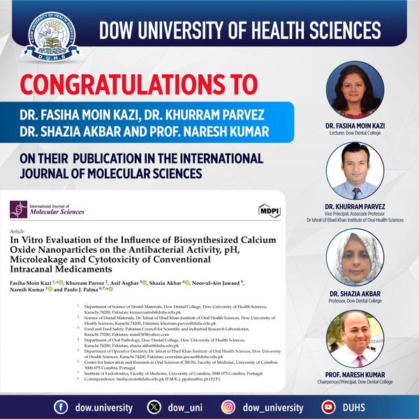 Congratulations to Dr. Fasiha Moin Kazi, Lecturer, Dow Dental College; Dr. Khurram Parvez, Vice Principal and Associate Professor, Dr. Ishrat Ul Ebad Khan Institute of Oral Health Sciences; Dr. Shazia Akbar, Professor, Dow Dental College; and Prof. Naresh Kumar, Chairperson/Principal, Dow Dental College, on their recent publication in the “International Journal of Molecular Sciences.”