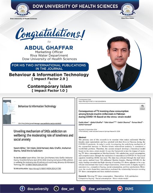 Congratulations to Mr. Abdul Ghaffar, Marketing Officer, Riva Water Department, Dow University of Health Sciences, on achieving two international publications in prestigious journals.
