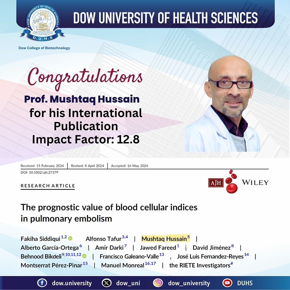 Prof. Mushtaq Hussain, Principal & Professor at Dow College of Biotechnology (DCoB) – DUHS, has published a Collaborative Work with Loyola University, Chicago, Harvard Medical School and Universidad Católica San Antonio de Murcian, Spain in the American Journal of Hematology (IF 12.8)