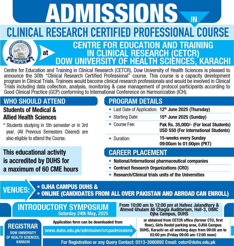 Dow University of Health Sciences (DUHS) is now accepting applications for the 30th “Clinical Research Certified Professional” course. This program trains participants to become proficient in clinical research, including data collection, analysis, monitoring, and case management, all in accordance with Good Clinical Practice (GCP) standards as per the International Conference on Harmonization (ICH).