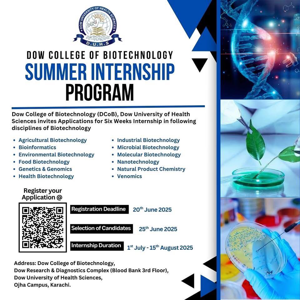 Now Accepting Applications – Internship Program 2025 (Six Weeks) Dow College of Biotechnology, DUHS