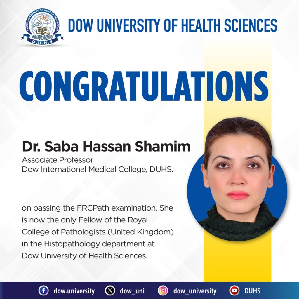 This prestigious accomplishment has earned her the distinction of being the only Fellow of the Royal College of Pathologists (United Kingdom) in the Histopathology department at Dow University of Health Sciences.