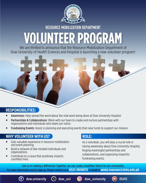 The Resource Mobilization Department of Dow University of Health Sciences and Hospital (DUHS) is excited to launch a brand new volunteer program. We’re seeking passionate individuals who share our vision of a healthier future for our community.