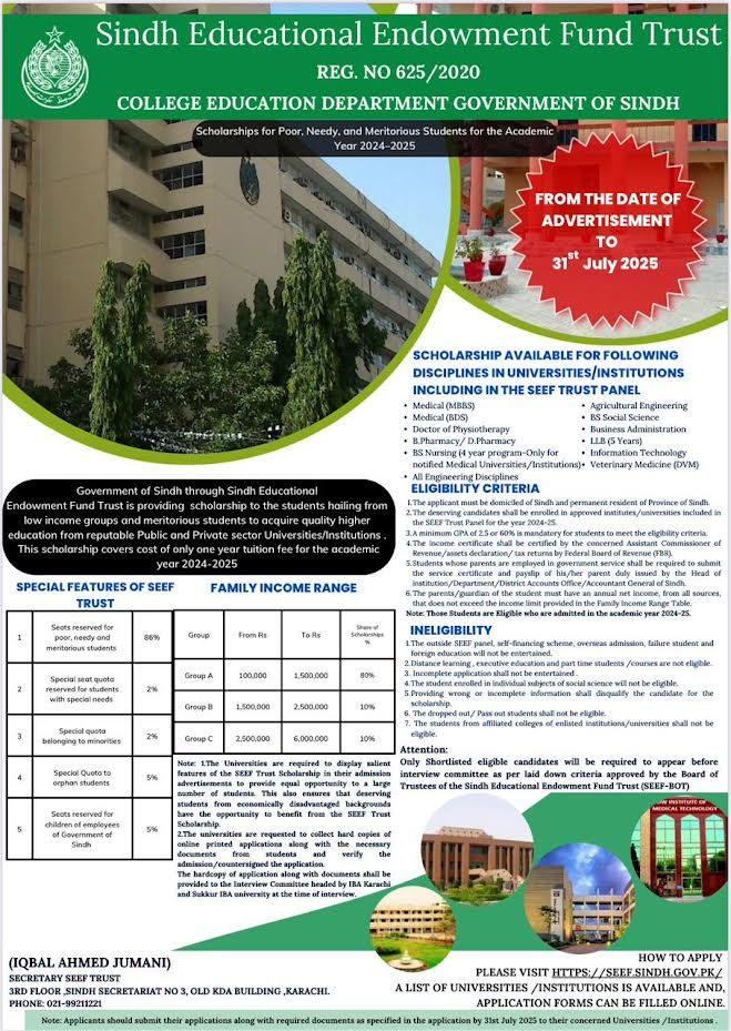 31st July 2025 (Apply online) HTTPS://SEEF.SINDH.GOV.PK/