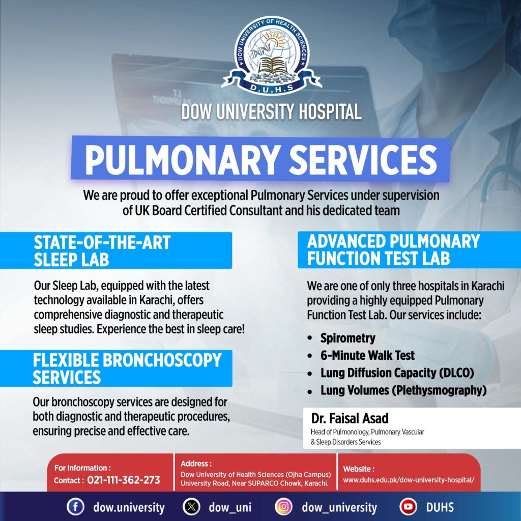 Dow University Hospital is proud to introduce our cutting-edge Pulmonary Services, featuring the latest technology and highly skilled professionals. Our facilities include a top-tier Sleep Lab and a fully equipped Pulmonary Function Test Lab, one of only three in Karachi.