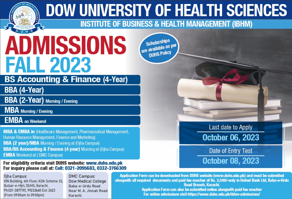 BBA, BSAF, MBA, EMBA Admissions Fall 2023 Institute of Business and Health Management (IBHM), DUHS